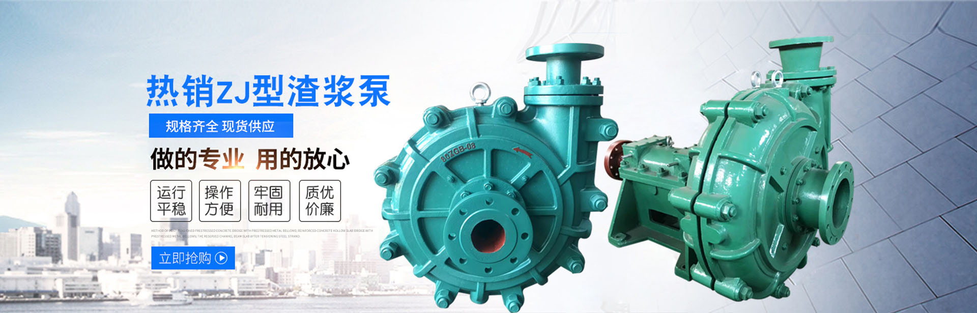 石家庄国石泵业有限公司是以渣浆泵实用性为生产理念,集高新技术应用、制造于一体的科技型渣浆泵厂家。我公司主要设计研发渣浆泵、泥浆泵、衬胶泵、砂砾泵、液下渣浆泵、污泥泵、污水泵及配套备件。主要为环境保护、污水处理、电力煤炭、石油化工、冶金矿山,建材火电、烟气脱硫、农田灌溉等提供泵类产品和服务。   公司设有铸造车间、机械加工、氟塑料压制、装配车间、研发技术、质检、销售业务部、客户服务部等部门。   公司拥有雄厚的技术力量,建有测试精度达到国际标准的渣浆泵高压试泵站和工业泵实验、测试检验中心。拥有CFD、CAE先进的设计手段,专门从事渣浆泵、脱硫泵、污水泵的设计理论、水泵性能、磨损机理、耐磨材料和新产品开发的实验研究工作。公司产品有十几个系列,100多个品种,产品高效、寿命长、可靠性高、易维护